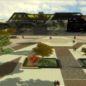 پلان طبقه همکف این پروژه معماری با مساحتی بالغ بر 4000 متر مربع به صورت پیوسته طراحی شده است همچنین پلان معماری طبقه همکف این پروژه معماری دارای پند دسترسی می باشد یکی از این دسترسی ها که در ضلع جنوبی سایت می باشد به عنوان دسترسی اصلی در نظر گرفته شده است که مقابل دسترسی اصلی از خیابان به سایت پلان می باشد این طبقه همچنین دارای فضاهای سالن های نمایش آثار، مجموعه اصلی آمفی تئاتر و کلاس های آموزشی می باشد